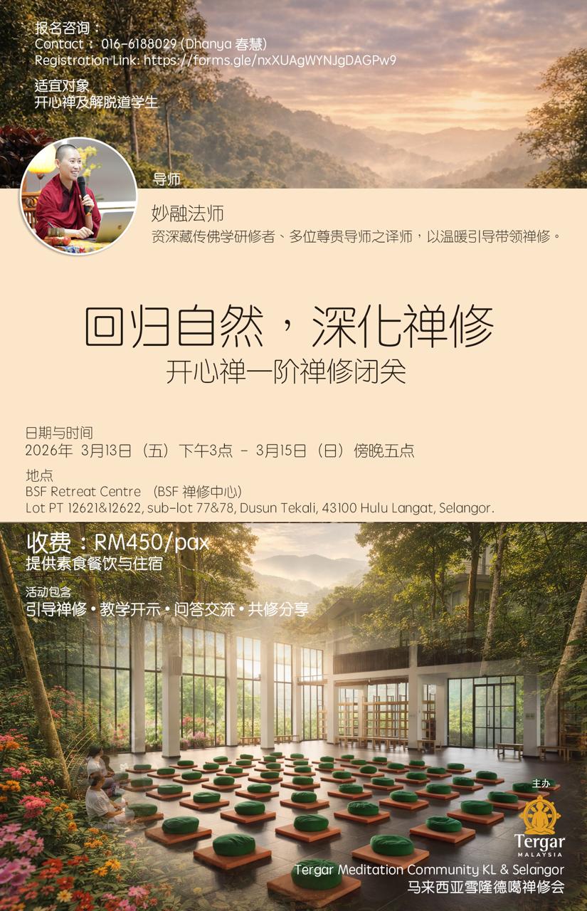 Give yourself the gift of slowing down—return to the embrace of nature and reconnect with your inner awareness. Surrounded by lush greenery and tranquility at BSF Retreat Centre, Tzunma Miaorong’s guidance will help deepen your practice.